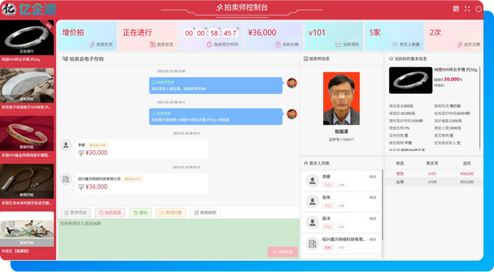 拍賣師可在拍賣控制臺主持競拍,拍賣師發(fā)言、暫停/開始、出價回滾、流拍、撤拍等!